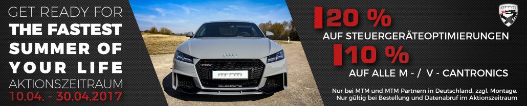 Wer mit seinem Audi, VW, Seat, Skoda oder auch Porsche noch sportlicher unterwegs sein will und mehr Drehmoment und Leistung sucht, kann jetzt seinen MTM Partner aufsuchen. Vom 10.04. bis 30.04.2017 gibt MTM auf seine Leistungssteigerungen über das Steuergerät einen Rabatt in Höhe von 20 % und auf alle M-/VCantronics einen Rabatt in Höhe von 10 %. Der MTM-Rabatt gilt für alle Bestellungen, die im Zeitraum vom 10.04. bis zum 30.04.2017 bei MTM oder einem autorisierten MTM Partner in Deutschland eingehen. Weitere Auskünfte – auch zur Verfügbarkeit von Leistungssteigerungen – gerne bei TheGarage unter 09081/275780-0 oder unter www.the-garage.info